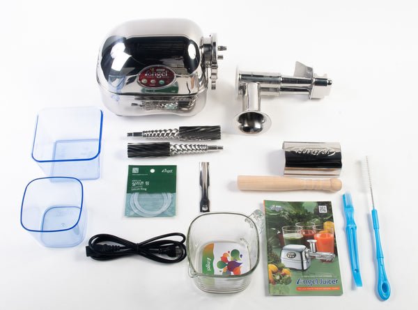 | PACKAGE CONTENTS | Motor Base Unit x 1 Twin Gear Set x 1 Standard Housing Filter x 1 Splash Guard x 1 Power Cord x 1 Angel Glass Juice Cup x 1 Plastic Juice & Pulp Cup (Large) x 1 Plastic Juice & Pulp Cup (Medium) x 1 Cleaning Brush x 1 Premium Brush x 1 Wooden Pusher Standard x 1 Cleaning Knife x 1 Silicon Sealing O-Ring Set x 1 Operation Manual x 1 |